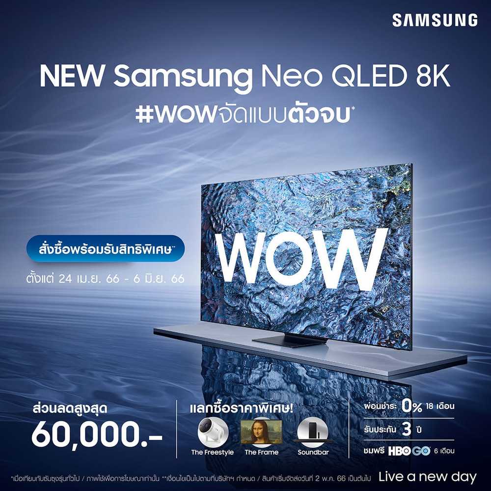 ซัมซุงเปิดทางเลือกให้ผู้บริโภคตลาดทีวีพรีเมียมมากขึ้นด้วยการสัมผัสประสบการณ์การรับชมแบบ WOWจัดแบบตัวจบ สำหรับ Neo QLED TV 8K พบโปรโมชั่นพิเศษตั้งแต่วันที่ 24 เมษายน – 6 มิถุนายน 2566 ทาง https://www.samsung.com/th/tvs/early-order/ และร้านค้าชั้นนำทั่วประเทศ