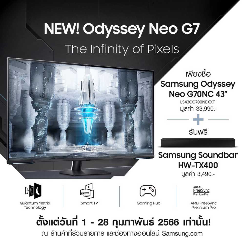 Samsung Odyssey Neo G7 เริ่มวางจำหน่ายแล้ววันนี้พร้อมโปรโมชันสุดพิเศษ แถมฟรี Soundbar HW-T400 มูลค่า 3.490 บาท เมื่อซื้อ Samsung Odyssey Neo G7 ตั้งแต่วันนี้ – 28 กุมภาพันธ์ 2566 ผ่าน samsung.com, Lazada, Shopee และร้านค้าที่ร่วมรายการ โดยผู้สนใจสามารถศึกษาข้อมูลเพิ่มเติมได้ที่ Samsung Odyssey Neo G7