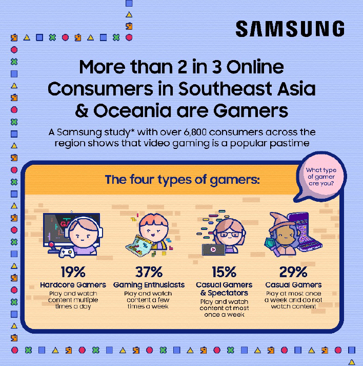 เป็นไปได้อย่างมากที่ทุกคนคือเกมเมอร์ หรือมีเพื่อนหรือสมาชิกในครอบครัวที่เป็นเกมเมอร์ ในความเป็นจริงแล้ว ผู้บริโภคออนไลน์ในภูมิภาคเอเชียตะวันออกเฉียงใต้และโอเชียเนีย 7 ใน 10 คนเป็นเกมเมอร์ ซึ่งการเล่นเกมถือเป็นกิจกรรมที่ผู้คนทุกวัยชื่นชอบ อ้างอิงจากผลการสำรวจข้อมูลเชิงลึกด้านการเล่นเกมจากซัมซุง