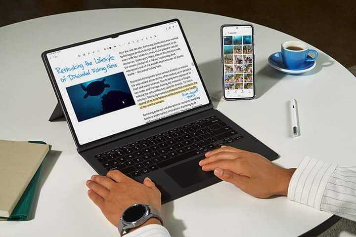 มากไปกว่านั้น Book Cover ซึ่งเป็นคีย์บอร์ดของ Galaxy Tab S9 และการทำงานของ DeX Mode ก็ได้มอบประสบการณ์ที่เปรียบเสมือนการใช้เดสก์ท็อปในรูปแบบของแท็บเล็ตน้ำหนักเบาพกพาง่ายและยังมาพร้อมกับประสิทธิภาพอันสูงสุดในขณะที่ทุกคนกำลังเดินทางท่องเที่ยวหรือต้องทำงานในระหว่างที่กำลังเดินทางนั้น อีกทั้งยังสามารถปรับเปลี่ยนคีย์บอร์ด Book Cover พร้อมทั้งแป้นพิมพ์ที่มีแสงออกมาให้ความรู้สึกเหมือนกำลังใช้งานบน PC และในขณะเดียวกัน DeX Mode ก็มาพร้อมกับเคอร์เซอร์ที่ช่วยให้ง่ายต่อการติดตาม และหน้าต่างที่สามารถปรับเปลี่ยนขนาดหรือการวางตำแหน่งได้อีกทั้งยังรองรับ Second Screen หรือความสามารถในการเป็นหน้าจอที่สองในการสะท้อนหรือขยายหน้าจอของ PC ไปยังแท็บเล็ตได้ นอกจากนี้ผู้ใช้ยังสามารถทำงานร่วมกันได้สะดวกยิ่งขึ้นโดยการแชร์หน้าจอและทำการแก้ไขข้อมูลบน Samsung Note แบบเรียลไทม์ไปพร้อมกันได้ผ่าน Google Meet