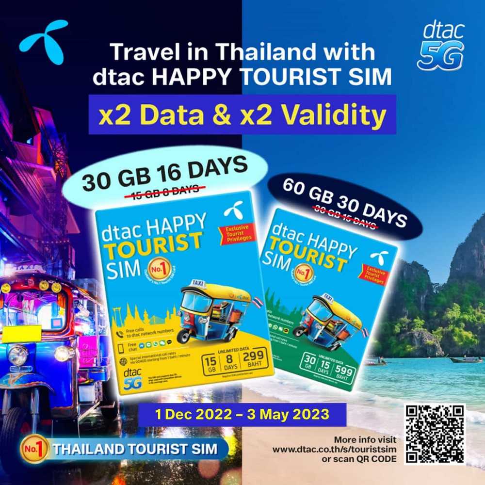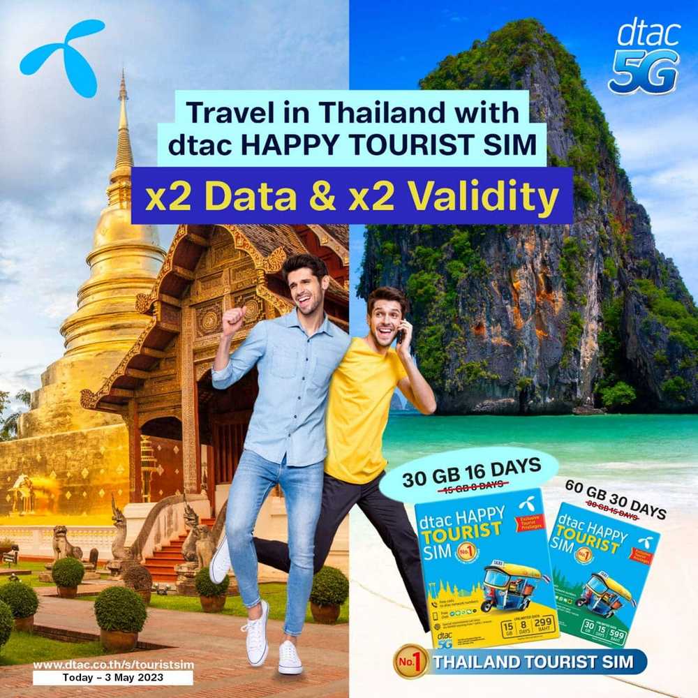 • ซิมดีแทค แฮปปี้ ทัวริสต์ 599 บาท สำหรับใช้งาน 15 วัน เติมวันใช้งานได้เพิ่ม 2 เท่า เป็น 30 วันและเพิ่มอินเทอร์เน็ตจาก 30 GB เป็น 60 GB