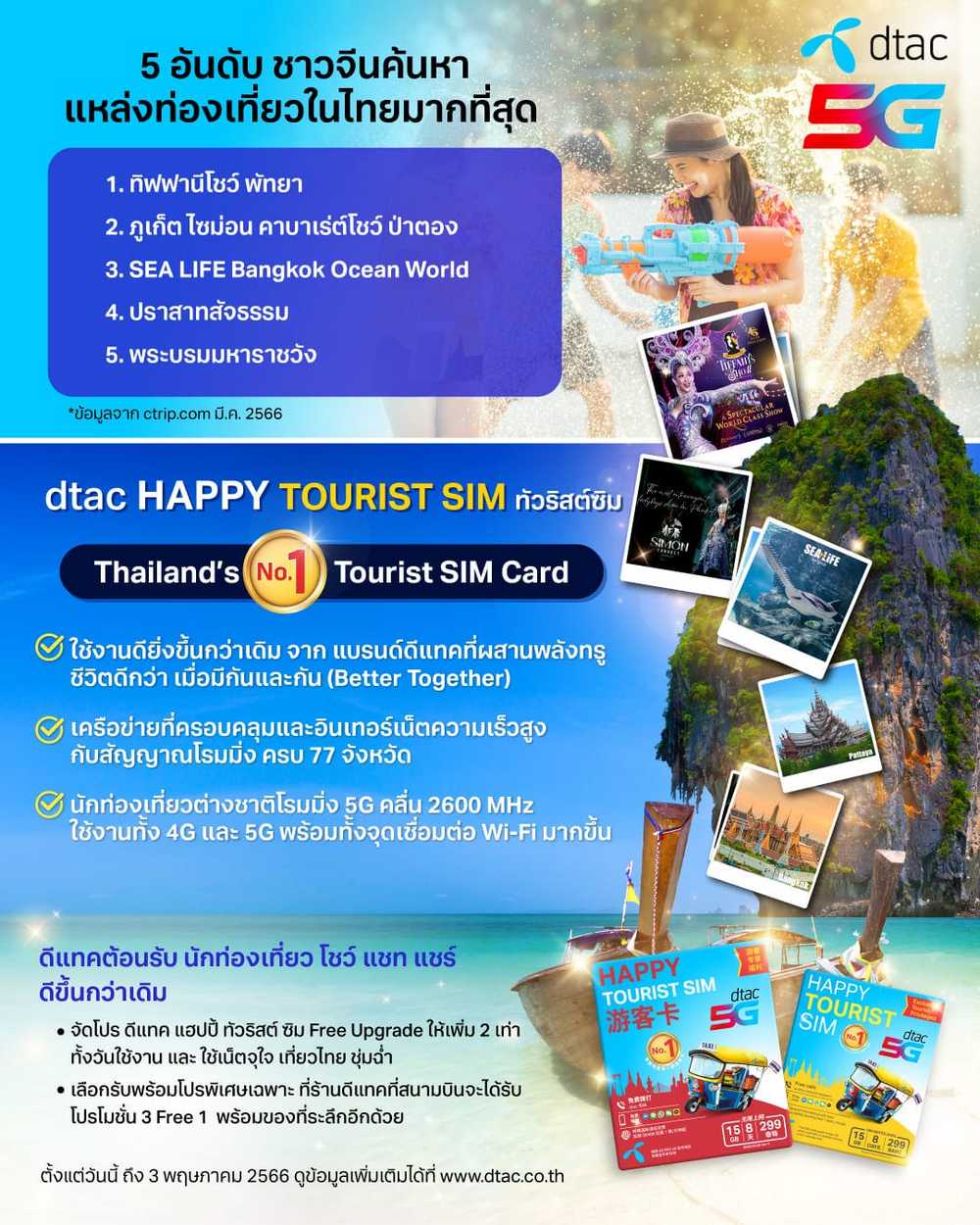 ดีแทคเตรียมพร้อมต้อนรับนักท่องเที่ยวจีน ที่วางแผนเดินทางมาท่องเที่ยวในช่วงเทศกาลสงกรานต์และช่วงวันแรงงานจีน ซึ่งเป็นวันหยุดยาวในปีนี้ ข้อมูลการท่องเที่ยวแห่งประเทศไทย คาดว่าในเดือนเมษายนนี้ จะมีนักท่องเที่ยวจีนเดินทางเข้ามา 2.5 ถึง 3 แสนคน ส่วนนักท่องเที่ยวโดยรวมน่าจะอยู่ที่ประมาณ 1-2 ล้านคน ดีแทค แฮปปี้ ทัวริสต์ซิม ซึ่งเป็น No.1 ทัวริสต์ซิม ที่มีส่วนแบ่งทางการตลาดในกลุ่มนักท่องเที่ยวจีนอันดับ 1 จัดโปรโมชั่นสุดพิเศษโดนใจนักท่องเที่ยวเดินทางทั่วไทย เหนือจรดใต้ ได้ประสบการณ์ดีขึ้น ทั้งโพสต์รูป อัพคลิปวีดีโอ โซเชียลมีเดีย ฟังเพลง ผ่านแอปพลิเคชันต่างๆ กับโปรสุดคุ้ม Free Upgrade ซิมดีแทค แฮปปี้ ทัวริสต์ให้เบิ้ล 2 ทั้ง วันใช้งาน และ อินเทอร์เน็ต จากแบรนด์ดีแทคที่ผสานพลังทรู ชีวิตดีกว่า เมื่อมีกันและกัน (Better Together) ทำให้ดีแทค แฮปปี้ ทัวริสต์ซิม ใช้งานดียิ่งขึ้นกว่าเดิม ด้วยเครือข่ายที่ครอบคลุมและอินเทอร์เน็ตความเร็วสูง กับสัญญาณโรมมิ่ง ครบ 77 จังหวัด นักท่องเที่ยวต่างชาติสามารถโรมมิ่ง 5G คลื่น 2600 MHz ใช้งานทั้ง 4G และ 5G พร้อมทั้งจุดเชื่อมต่อ Wi-Fi มากขึ้น ซื้อซิมดีแทคได้เลยที่ https://www.dtac.co.th/en/prepaid/products/tourist-sim.html และนักท่องเที่ยวที่ลงเครื่องแล้ว สามารถแวะเปิดซิมใช้บริการได้ที่ เคาน์เตอร์ดีแทค สนามบินสุวรรณภูมิ ดอนเมือง และภูเก็ต ได้ตั้งแต่วันนี้