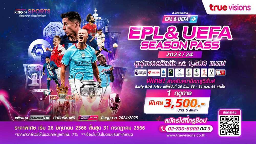 - แพ็กเกจ EPL&UEFA SEASON PASS 2023/24” EARLY BIRD คลิก https://bit.ly/42yI17a