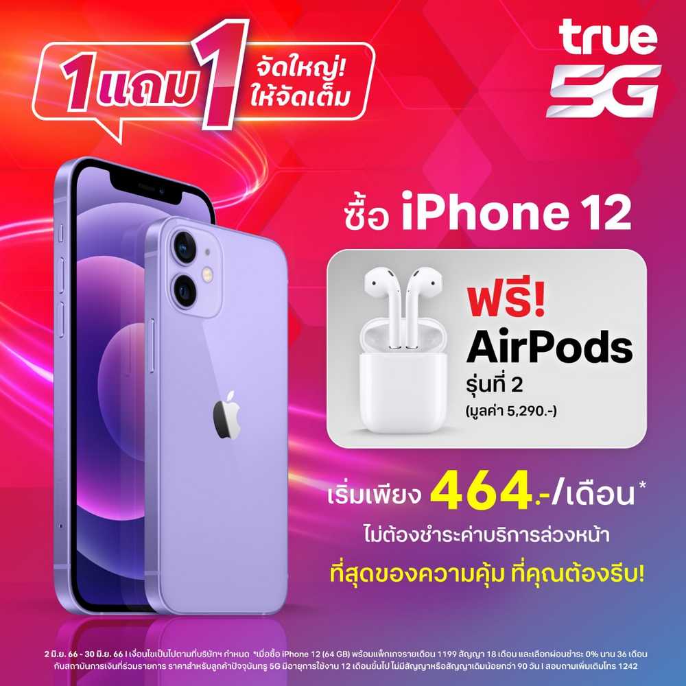 กรุงเทพฯ 14 มิถุนายน 2566 – พบข้อเสนอที่สุดของความคุ้ม 1 แถม 1 …วันนี้ลูกค้าทรู 5G เป็นเจ้าของ iPhone 12 ได้ง่ายขึ้น ผ่อนเริ่มต้นเพียง 464 บาทต่อเดือน* (เมื่อสมัครพร้อมแพ็กเกจรายเดือน 5G Together 1,199 บาท สัญญา 18 เดือน) ไม่ต้องชำระค่าบริการล่วงหน้า พร้อมรับ AirPods รุ่นที่ 2 มูลค่า 5,290 บาท ฟรีทันทีหลังการสมัครบริการตามเงื่อนไข* … รีบเลยของมีจำนวนจำกัด ตั้งแต่วันนี้ถึง 30 มิถุนายน 2566 เท่านั้น