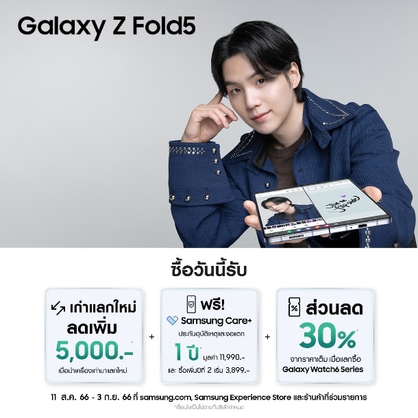 พิเศษสุดๆ กับโปรโมชั่นต้อนรับเข้าสมาคมพับ เมื่อซื้อ Galaxy Z Flip5, Galaxy Z Fold5 และ Galaxy Watch6 Series ผ่าน samsung.com, Samsung Experience Store และร้านค้าที่ร่วมรายการ ตั้งแต่วันนี้ 3 กันยายนนี้เท่านั้น