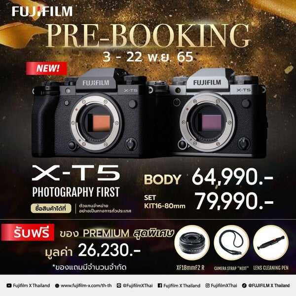FUJIFILM X-T5 มีให้เลือก 2 โทนสีทั้ง Black และ Silver เปิดพรีออร์เดอร์ทั้งสองผลิตภัณฑ์ได้ตั้งแต่ 3 – 22 พฤศจิกายน 2565 ที่ตัวแทนจำหน่ายอย่างเป็นทางการทั่วประเทศ พร้อมรับของพรีเมี่ยมสุดพิเศษมูลค่ารวม 26,230 บาท
