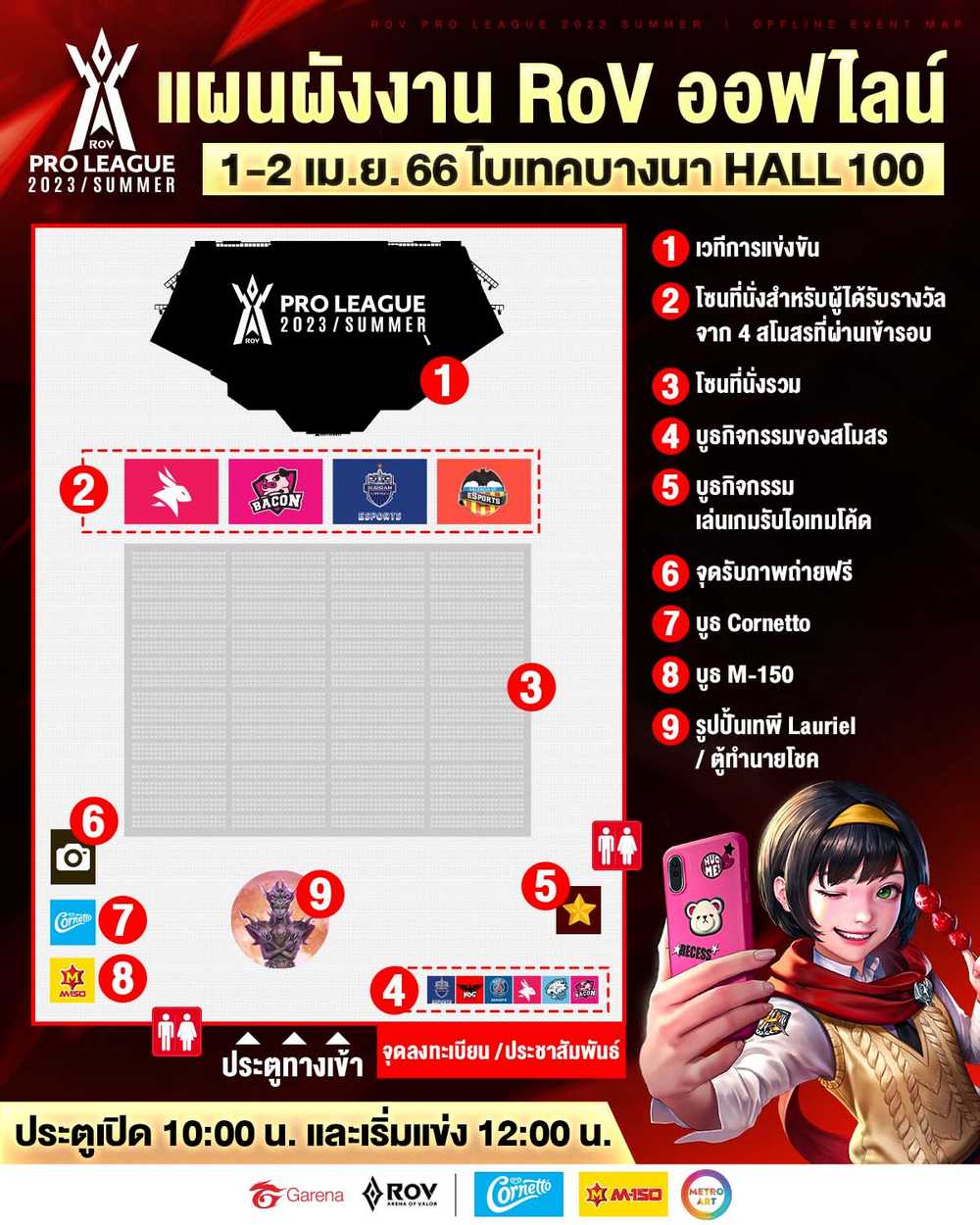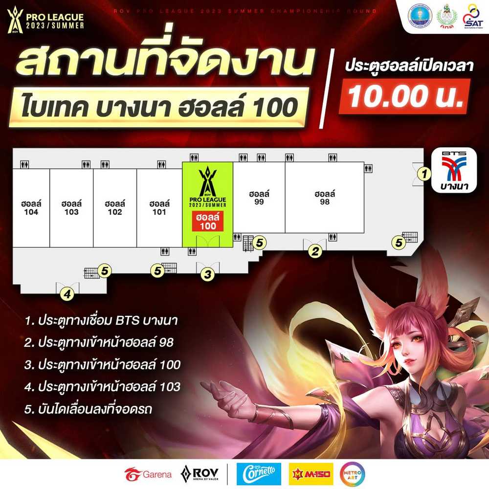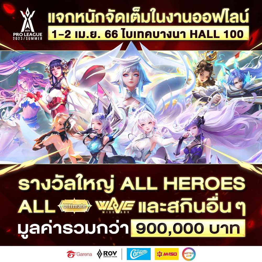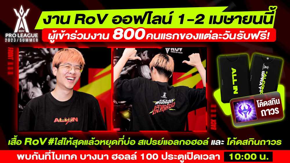 แฟนๆ RoV เตรียมมาพบปะ รับชม และเชียร์ทีมที่ชอบได้อย่างเต็มที่ เพราะการแข่งขันรอบ Championship ที่จะมีขึ้นในวันที่ 1-2 เมษายน 2566 ที่ไบเทค บางนา Hall 100 นี้ เป็นงานเปิดที่เหล่าแฟน ๆ และผู้ชมสามารถเข้าร่วมงานได้ฟรี ไม่เสียค่าใช้จ่าย และไม่จำกัดจำนวนคน สำหรับผู้เข้าร่วมงาน 800 คนแรก รับฟรีเสื้อ RoV ใส่ให้สุดแล้วหยุดที่บ่อ สเปรย์แอลกอฮอล์ ALL IN และโค้ดสกินถาวร