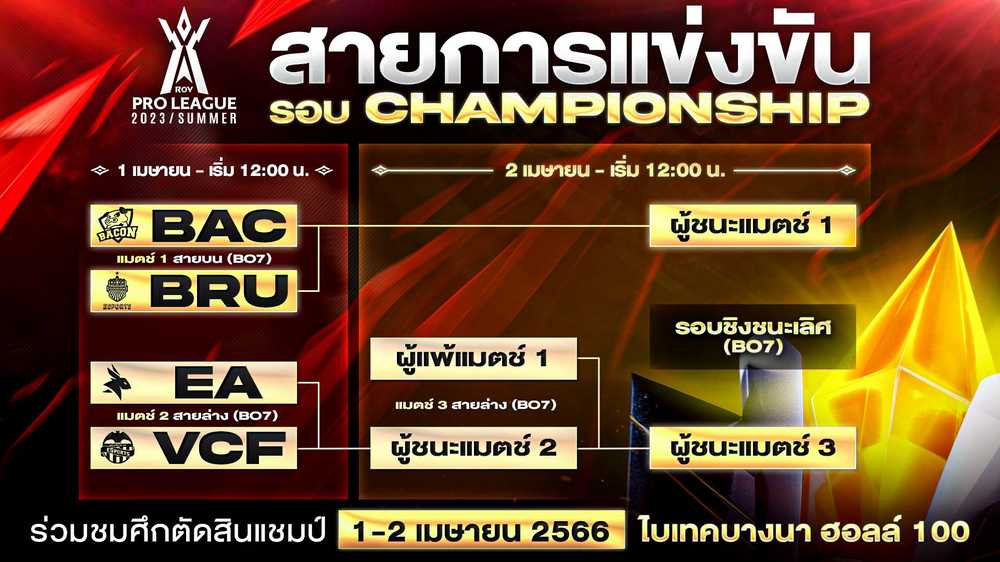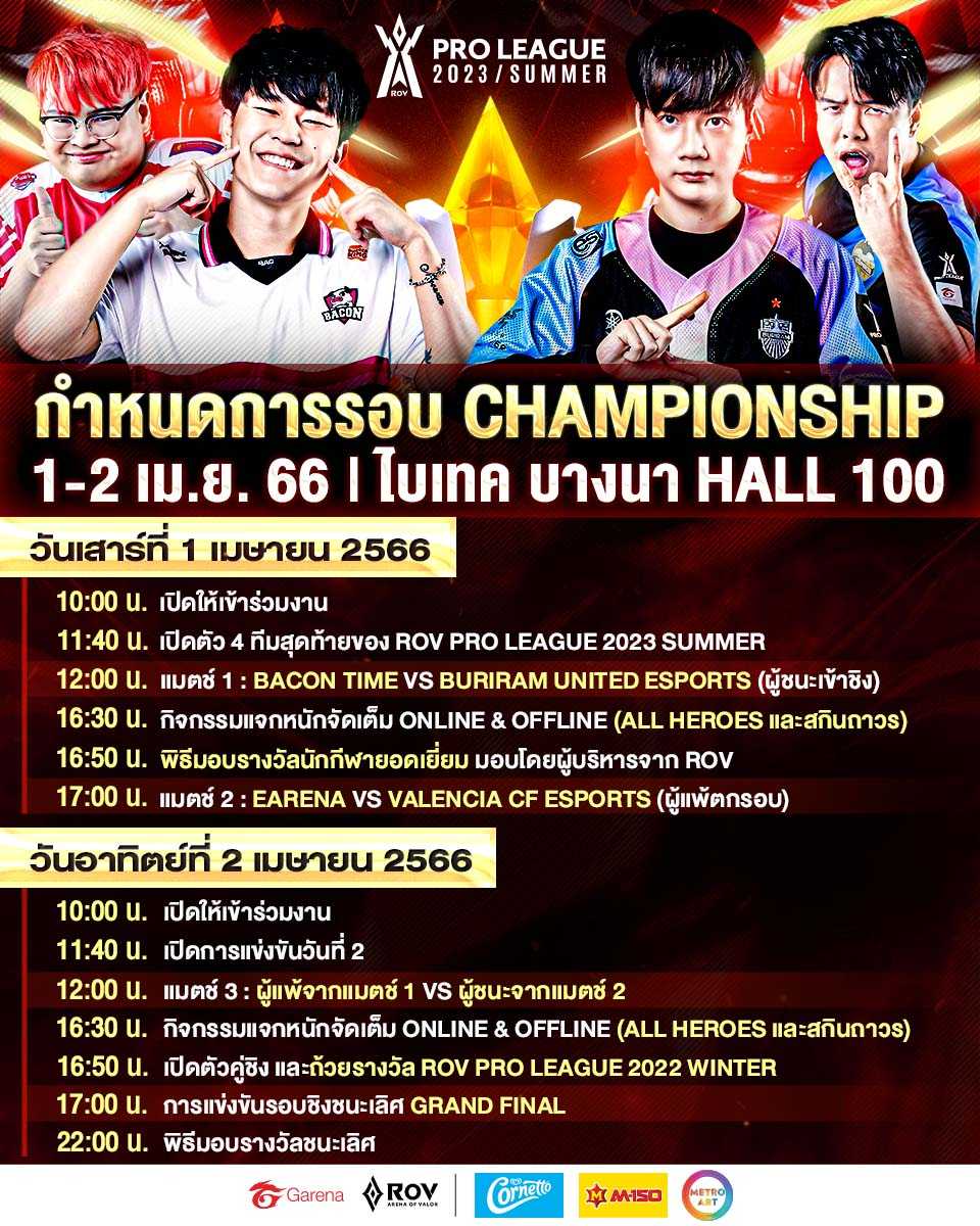 อีกเพียงไม่กี่วันเราก็จะได้รู้กันแล้วว่า ใครจะได้แชมป์ในซีซันที่ 11 ในศึกรอบ Championship ของการแข่งขัน RoV Pro League 2023 Summer ซึ่งจะจัดขึ้นในรูปแบบงานออฟไลน์ในวันที่ 1-2 เมษายน 2566 ณ ไบเทค บางนา Hall 100 โดย 4 ทีมสุดท้ายที่จะมาชิงชัยกันได้แก่ Bacon Time แชมป์โปรลีก 2 ซีซันล่าสุด รวมถึงแชมป์รายการนานาชาติล่าสุดอย่าง APL 2022 ผู้ครองอันดับ 1 ของตารางมาตั้งแต่สัปดาห์ที่ 1 ถึงสัปดาห์ที่ 8 ส่วนทีมที่ 2 คือแชมป์โปรลีก 2 สมัยติดต่อ และแชมป์นานาชาติ AIC 2021 อย่าง Buriram United Esports ที่ทำผลงานได้ดี จนเก็บแต้มเกาะเป็นที่ 2 ของตาราง ทีมที่ 3 ตกเป็นของทีมม้ามืดในซีซันนี้อย่างกระต่ายคลั่ง eArena ที่โชว์ร้อนแรง เอาชนะทีมใหญ่ อีกทั้งยังหยุดสถิติชนะต่อเนื่องของ Bacon Time จนเก็บแต้มขึ้นมาเป็น Top 4 ซึ่งนี่ถือเป็นการเข้ารอบ Championship ครั้งแรกของพวกเขาอีกด้วย และทีมสุดท้ายนั่นคือเจ้าค้างคาว Valencia CF Esports ที่ลุยโกยแต้มตั้งแต่ครึ่งฤดูกาลแรก จนส่งผลให้พวกเขาผ่านเข้ารอบ Championship ได้สำเร็จ