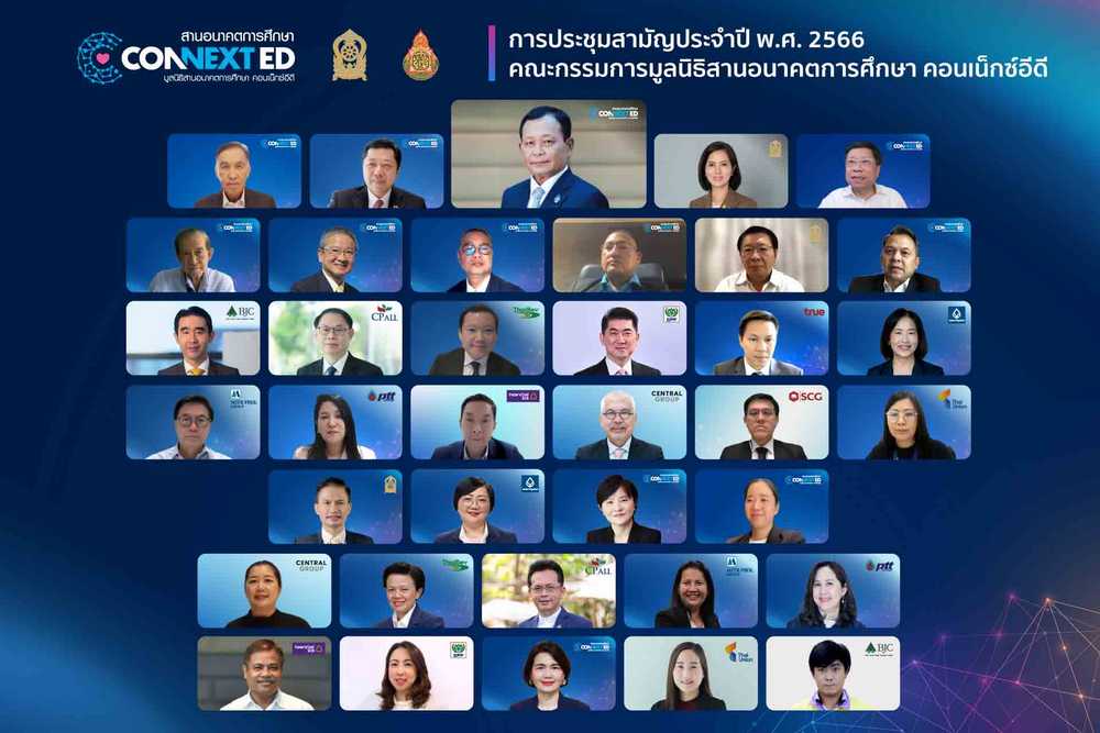 เดินหน้าผนึกกำลังเพื่อการศึกษาไทยที่มั่นคงและยั่งยืน…มูลนิธิสานอนาคตการศึกษา คอนเน็กซ์อีดี จัดการประชุมสามัญ ประจำปี 2566 คณะกรรมการมูลนิธิฯ เป็นปีที่ 4 ในรูปแบบออนไลน์ นำโดย องคมนตรี พลเอก ดาว์พงษ์ รัตนสุวรรณ (กลาง – แถวบน) ในฐานะประธานที่ปรึกษากิตติมศักดิ์ พร้อมด้วยคณะที่ปรึกษาและผู้ทรงคุณวุฒิจากภาครัฐ โดยนางสาวตรีนุช เทียนทอง (ที่ 2 จากขวา – แถวบน) รักษาการรัฐมนตรีว่าการกระทรวงศึกษาธิการ ภาคประชาสังคม และนายศุภชัย เจียรวนนท์ (ที่ 2 จากซ้าย – แถวบน) ประธานกรรมการมูลนิธิฯ และประธานคณะผู้บริหาร เครือเจริญโภคภัณฑ์ ตลอดจนซีอีโอ คณะผู้บริหารจาก 12 องค์กรผู้ร่วมก่อตั้ง และคณะทำงานมูลนิธิฯ เพื่อสานต่อภารกิจ ร่วมหารือและวางแผนงาน เดินหน้าความร่วมมือที่เข้มแข็งจากทุกภาคส่วน ในการร่วมยกระดับการจัดการการศึกษาในโรงเรียนคอนเน็กซ์อีดีที่อยู่ในสังกัดสพฐ. จำนวน 5,570 แห่ง ทั่วประเทศ โดยมีผลการดำเนินงานสำคัญและความคืบหน้าตาม 5 ยุทธศาสตร์หลัก ได้แก่
