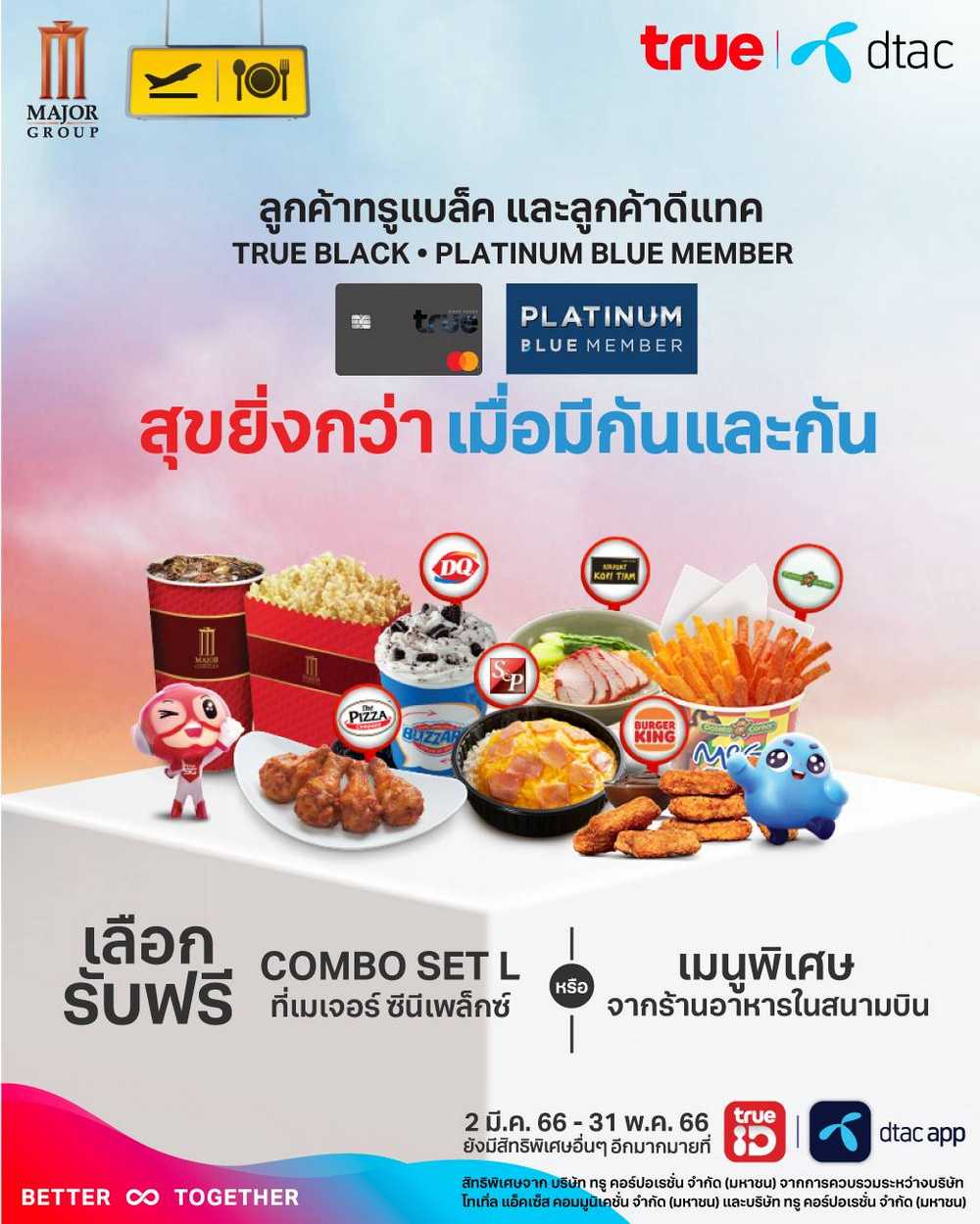 ก่อนบิน ทริปไหนก็ฟิน พิเศษสำหรับลูกค้าทรูแบล็ค และดีแทค PLATINUM BLUE MEMBER รับฟรี! เมนู a la carte จาก 14 แบรนด์ดัง ณ ร้านค้าในสนามบินทั่วประเทศที่ร่วมรายการ อาทิ Berger King, Bonchon, S&P, Potato Corner, The Pizza Company อีกทั้งลูกค้าทรูรับสิทธิพิเศษส่วนลดอาหารและเครื่องดื่ม สูงสุด 15% หรือใช้ทรูพอยท์+เงิน แลกซื้อราคาสุดคุ้ม อาทิ ใช้ทรูพอยท์ 149 คะแนน แลกซื้อ Kimchi Soup + Rice
