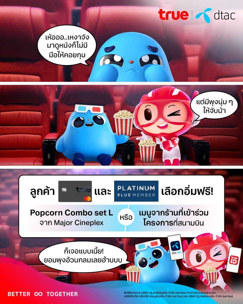 ดูหนังคลายร้อนรับซัมเมอร์ เอาใจคอหนังให้ฟินถึงใจ พร้อมใช้เวลาวันหยุดพักผ่อนกับวันแห่งครอบครัวหรือคนรู้ใจ พิเศษสำหรับลูกค้าทรูแบล็ค และดีแทค PLATINUM BLUE MEMBER รับฟรี Combo Set L (ป๊อปคอร์น 64 oz.+ น้ำอัดลม 32 oz.) อีกทั้งลูกค้าทรูและดีแทค รับดีลพิเศษสุดคุ้มค่าอีกมากมาย ทั้งแลกตั๋วหนัง ซื้อชุด Combo Set ราคาพิเศษ อาทิ ใช้ 1 ทรูพอยท์ ซื้อตั๋วหนังราคา 109 บาท, ใช้ 99 ทรูพอยท์ +139 บาท รับชุด Combo Set L หรือลูกค้าดีแทค เพียงใช้ 1,800 reward coins ดูหนังสุดคุ้ม 99 บาท ที่ เมเจอร์ ซีนีเพล็กซ์ ทุกสาขาทั่วประเทศ