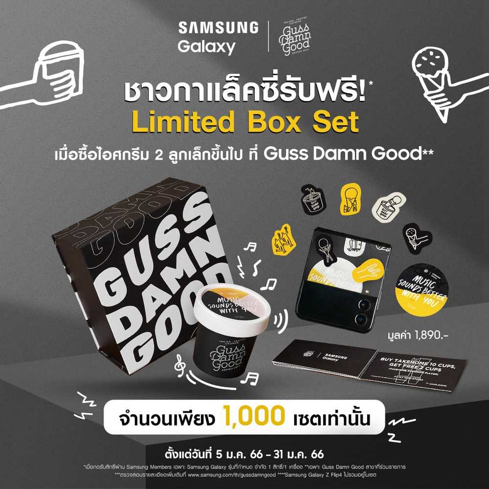 1. สำหรับลูกค้าที่ใช้ Samsung Galaxy รุ่นที่กำหนด เมื่อซื้อไอศกรีมรสชาติใดก็ได้ในร้าน Guss Damn Good สาขาที่ร่วมรายการ ตั้งแต่ 2 ไมโครสกู๊ป (2 Micro scoops หรือ 2 ลูกเล็ก) ขึ้นไป ตั้งแต่วันที่ 5 ม.ค. 66 – 31 ม.ค. 66 หรือจนกว่า Limited Box Set จะหมด รับฟรี Box Set มูลค่ารวม 1,890 บาท ประกอบด้วย