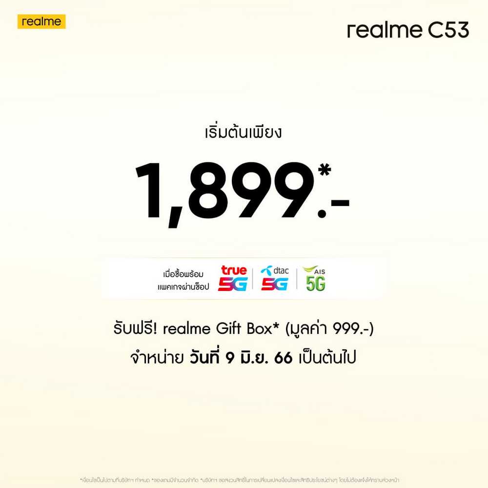 - realme Brand Shop และตัวแทนจำหน่ายทั่วประเทศ รับฟรี! realme Gift Box มูลค่า 999 บาท (จำนวนจำกัด)