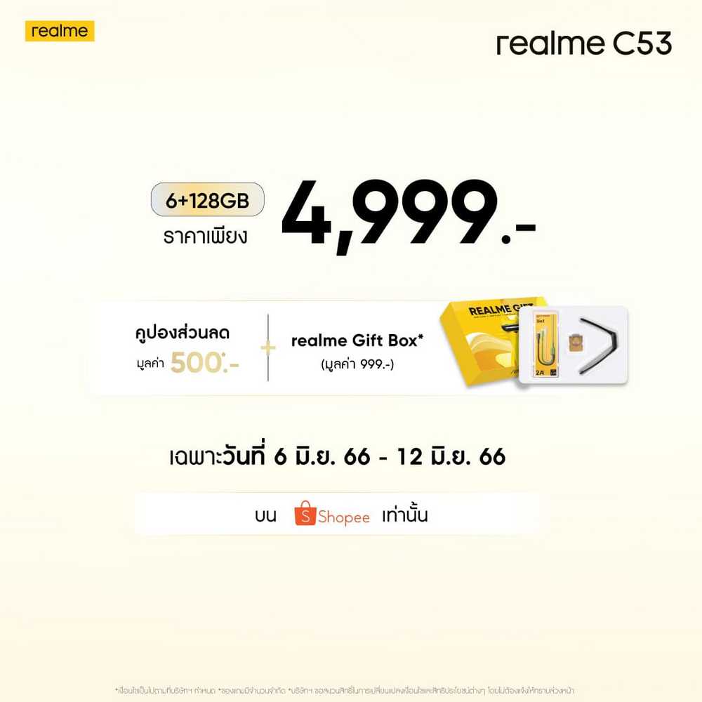 - ช่องทาง Shopee เฉพาะวันที่ 6 – 12 มิถุนายน รับคูปองส่วนลดสูงสุด 500 บาท และ realme Gift Box มูลค่า 999 บาท (จำนวนจำกัด)