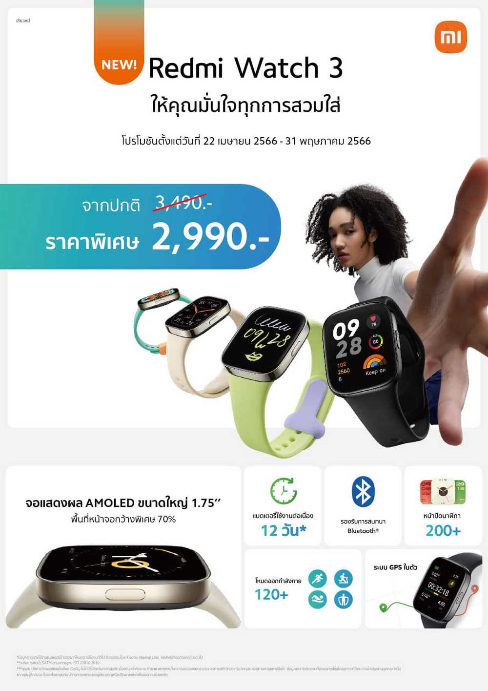 สำหรับลูกค้าที่ซื้อ Redmi Watch 3 ในระหว่างวันที่ 22 เมษายน 2566 – 31 พฤษภาคม 2566 สามารถซื้อสินค้าได้ในราคาพิเศษเพียง 2,990 บาทเท่านั้น
