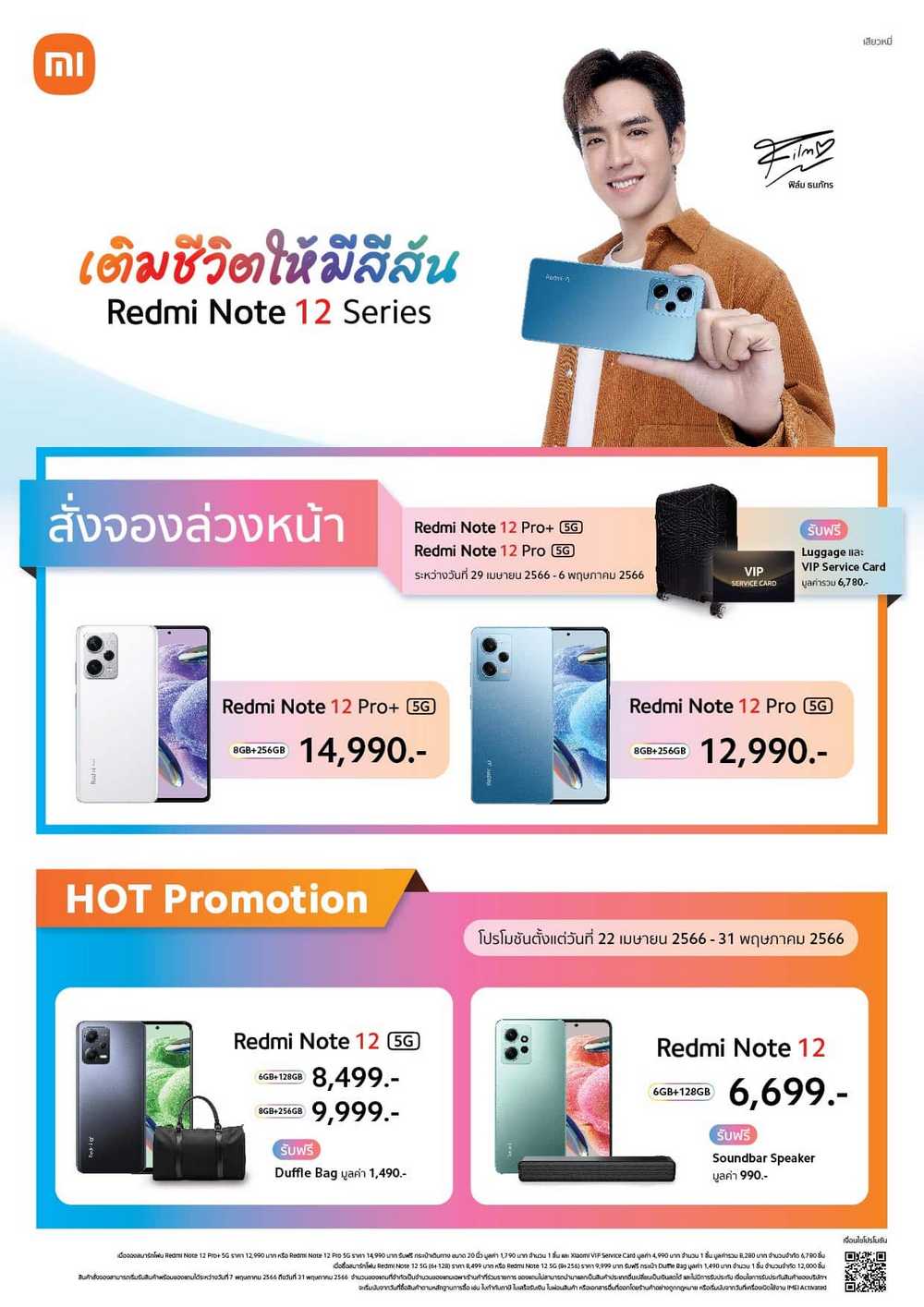 พิเศษ! สำหรับลูกค้าที่ซื้อ Redmi Note 12 5G หรือ Redmi Note 12 ในระหว่างวันที่ 22 เมษายน 2566 – 31 พฤษภาคม 2566 รับฟรีของสมนาคุณพิเศษ! เมื่อซื้อ Redmi Note 12 5G รับฟรี กระเป๋า Duffle Bag มูลค่า 1,490 บาท1 และเมื่อซื้อ Redmi Note 12 รับฟรี ลำโพง Soundbar Speaker มูลค่า 990 บาท1