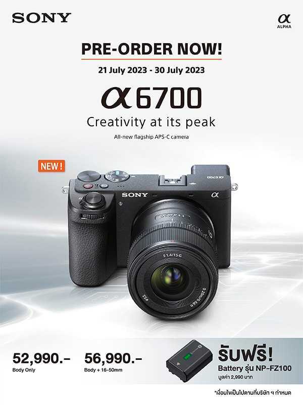 พร้อมรับสิทธิพิเศษสำหรับผู้ที่สั่งจองกล้องในช่วงเวลาดังกล่าว โดยจะได้รับแบตเตอรี่รุ่น NP-FZ100 จำนวน 1 ก้อน มูลค่า 2,990 บาท ทั้งนี้ กล้อง α6700 จะเริ่มวางจำหน่ายอย่างเป็นทางการ ตั้งแต่วันที่ 7 สิงหาคม ศกนี้ เป็นต้นไป