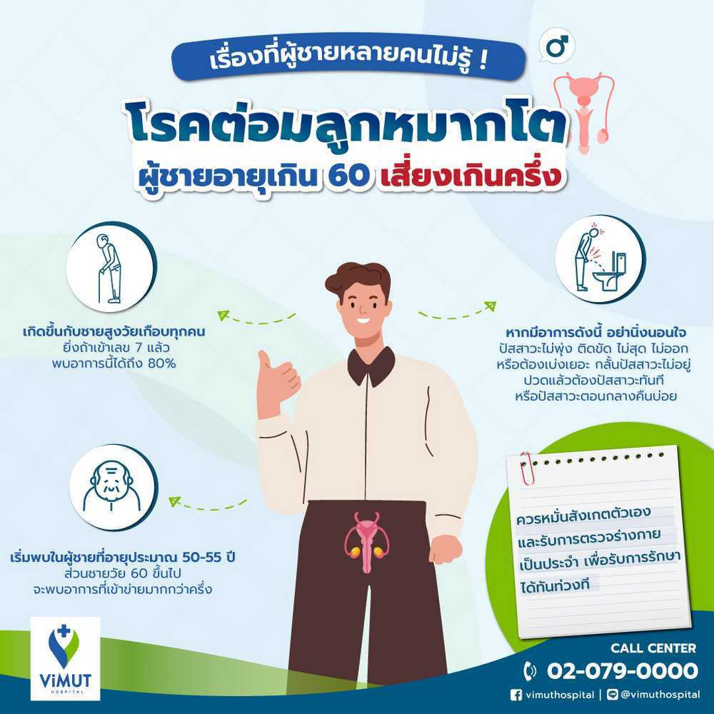 สำหรับผู้ที่สนใจพบแพทย์เพื่อรักษาภาวะต่อมลูกหมากโต หรือสอบถามข้อมูลเพิ่มเติมสามารถติดต่อได้ที่ศูนย์ศัลยกรรม (ระบบทางเดินปัสสาวะ) ชั้น 4 โรงพยาบาลวิมุต พหลโยธิน หรือโทรศัพท์นัดหมาย 02-079-0040 เวลา 08.00 – 20.00 น.