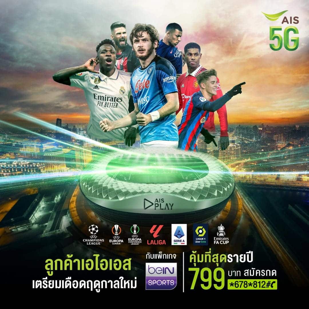 AIS PLAY ชวนแฟนบอลชาวไทยต้อนรับการเปิดฤดูกาลของศึกลูกหนังระดับโลก กับสุดยอดลีกยุโรปชั้นนำ ไม่ว่าจะเป็น ลาลีกา สเปน, กัลโช่ เซเรียอา อิตาลี, ลีกเอิง ฝรั่งเศส และ ยูฟ่าแชมเปียนส์ลีก ให้แฟนบอลได้ประสบการณ์การรับชมแบบจัดเต็มครบทุกแมตช์ เริ่มพร้อมกัน 12 สิงหา 2566 ยิงสดติดขอบจอ AIS PLAY ทุกช่องทาง ด้วยการเป็นพันธมิตรกับช่องถ่ายทอดกีฬาอย่าง บีอิน สปอร์ตส์ ด้วยแพ็กเกจสุดคุ้มเพียง 799 บาท เท่านั้น ตอกย้ำการเป็นศูนย์กลางการรับชมสุดยอดคอนเทนต์กีฬาระดับพรีเมียมทั้งระดับประเทศและระดับโลกที่ดีที่สุดบน AIS PLAY