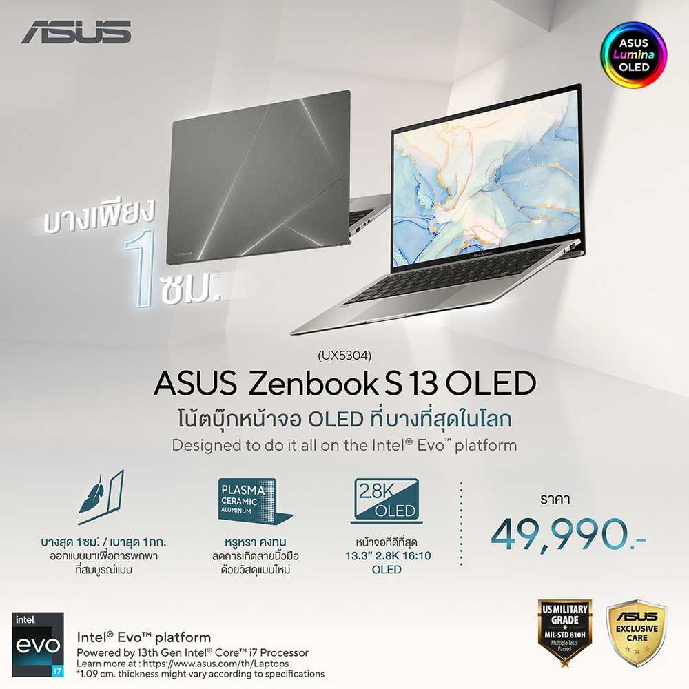 Zenbook S 13 OLED (UX5304) พร้อมวางจำหน่ายแล้ว ในราคา 49,990 บาท มาพร้อมการรับประกัน ASUS Exclusive Care ครอบคลุมการบริการซ่อมถึงที่ (on-site service) 3 ปี, ประกันระหว่างประเทศ 83 ประเทศทั่วโลก และประกันอุบัติเหตุ (Perfect Warranty) 1 ปีเต็ม พร้อมด้วย Windows 11 และ Pre-installed Office Home & Student 2021 ติดตั้งพร้อมใช้งานทันที พร้อมรับสมาชิก Adobe Creative Cloud® ฟรี เป็นระยะเวลาสามเดือน