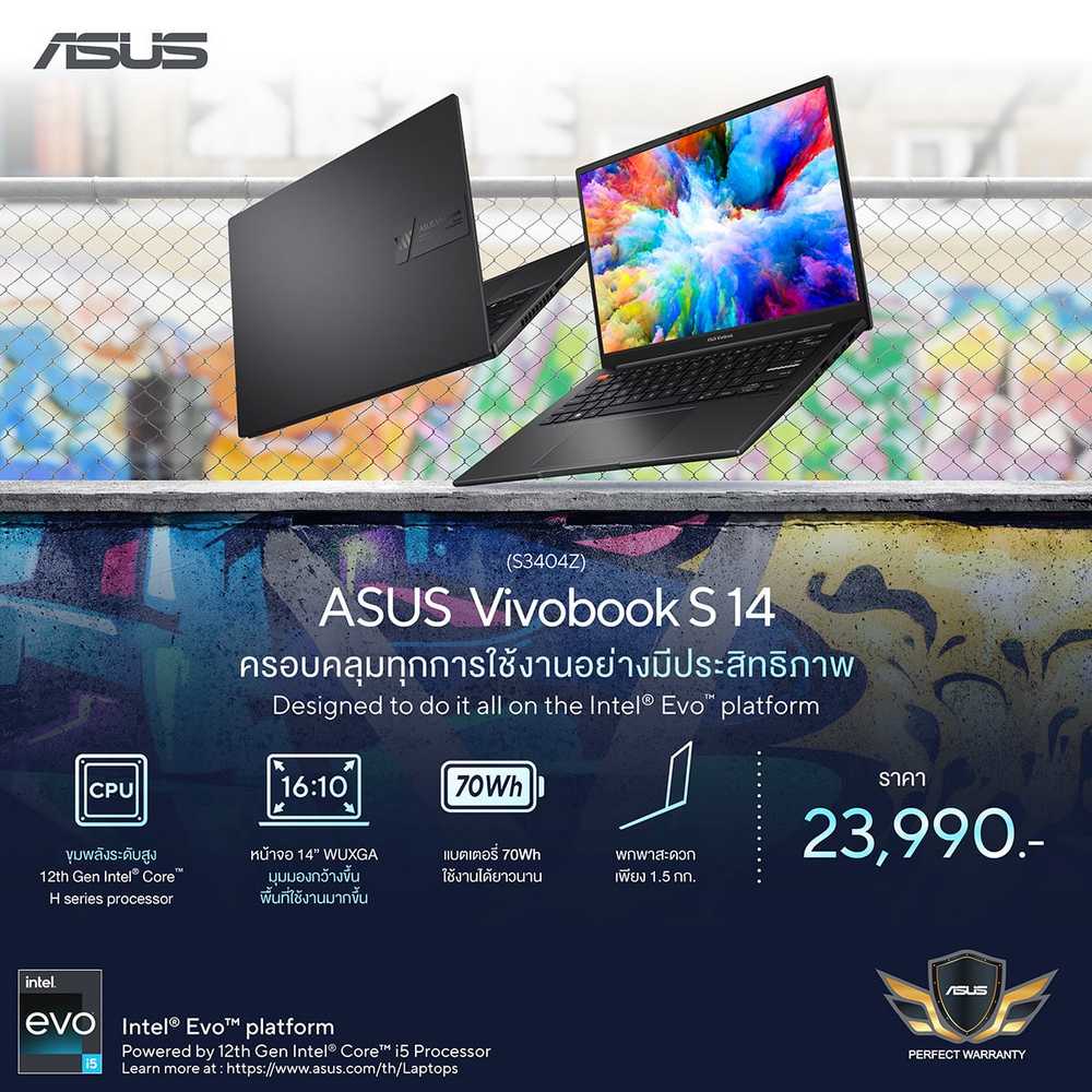 ASUS Vivobook S14 (S3404Z) วางจำหน่ายแล้วในราคา 23,990 บาท พร้อมการรับประกันตัวเครื่อง 2 ปีเต็ม ครอบคลุม 83 ประเทศทั่วโลก และการรับประกันอุบัติเหตุ (Perfect Warranty) 1 ปีแรก พร้อมด้วย Windows 11 และ Pre-installed Office Home & Student 2021 ติดตั้งพร้อมใช้งาน