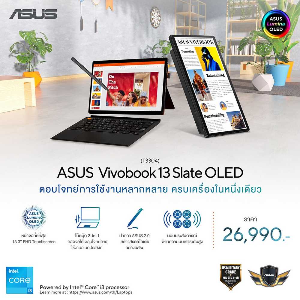 ASUS Vivobook 13 Slate OLED (T3304) วางจำหน่ายแล้วในราคา 26,990 บาท พร้อมการรับประกันตัวเครื่อง 2 ปีเต็ม ครอบคลุม 83 ประเทศทั่วโลก และการรับประกันอุบัติเหตุ (Perfect Warranty) 1 ปีแรก พร้อมด้วย Windows 11 และ Pre-installed Office Home & Student 2021 ติดตั้งพร้อมใช้งาน