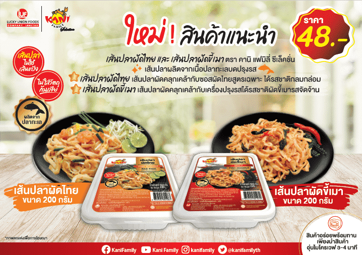 บริษัท ลัคกี้ ยูเนี่ยน ฟู้ดส์ จำกัด ภายใต้แบรนด์ คานิ แฟมิลี่ ซีเล็คชั่นแนะนำผลิตภัณฑ์ใหม่ เส้นปลาผัดไทย ขนาด 200 กรัม และ เส้นปลาผัดขี้เมา ขนาด 200 กรัม ตรา คานิ แฟมิลี่ ซีเล็คชั่นby BangkokStyle11/10/2021PR News