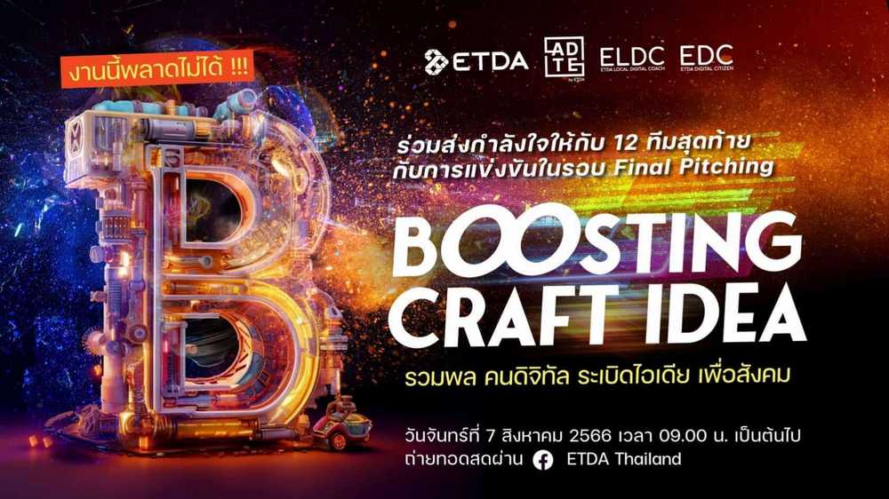 สำหรับประชาชนที่สนใจอยากร่วมลุ้นและเชียร์ว่า ทีมใดจะคว้ารางวัลสุดยอดแผนธุรกิจอีคอมเมิร์ซชุมชน จากกิจกรรม “Boosting Craft Idea รวมพล คนดิจิทัล ระเบิดไอเดีย เพื่อสังคม” ในปีนี้ สามารถติดตามการแข่งขันรอบชิงชนะเลิศได้ในวันจันทร์ที่ 7 สิงหาคม 2566 เวลา 09.00-15.30 น. ถ่ายทอดสดพร้อมกันที่ เพจเฟซบุ๊ก ETDA Thailand https://www.facebook.com/ETDA.Thailand สอบถามรายละเอียดเพิ่มเติมได้ที่ LINE ID : @craftidea3