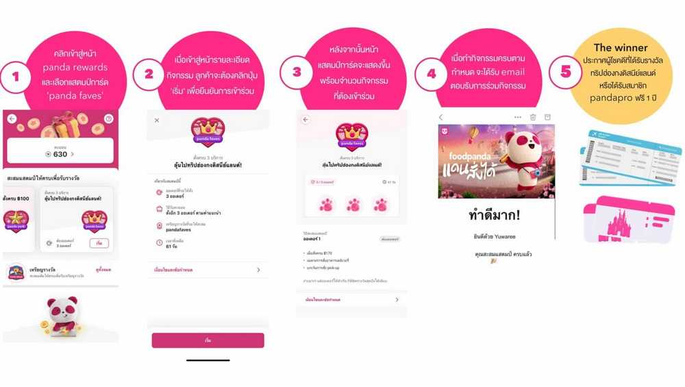 4. หลังทำครบทั้ง 3 ภารกิจ จะมีสิทธิ์ร่วมลุ้นเป็นผู้โชคดี จากนั้นเมื่อสิ้นสุดวันและเวลาร่วมสนุก ทาง foodpanda จะประกาศรายชื่อผู้โชคดีที่ได้รับรางวัล ในวันที่ 9 สิงหาคม 2566 บน foodpanda เฟซบุ๊กเพจ (สิทธิ์มีจำกัด เงื่อนไขเป็นไปตามที่บริษัทกำหนด)