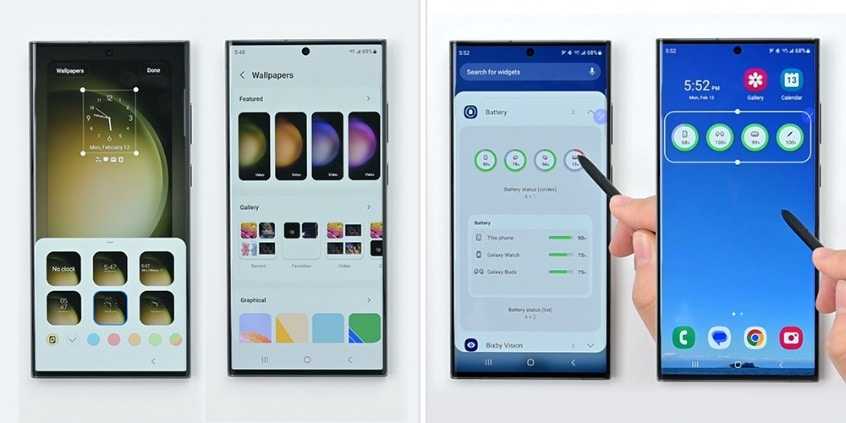 (ซ้าย) ปรับแต่งหน้าล็อกสกรีนด้วยวิดเจ็ทนาฬิกาหลายรูปแบบและพื้นหลังมากมาย (ขวา) หน้าปรับแต่งวิดเจ็ทแบตเตอรี่แบบใหม่