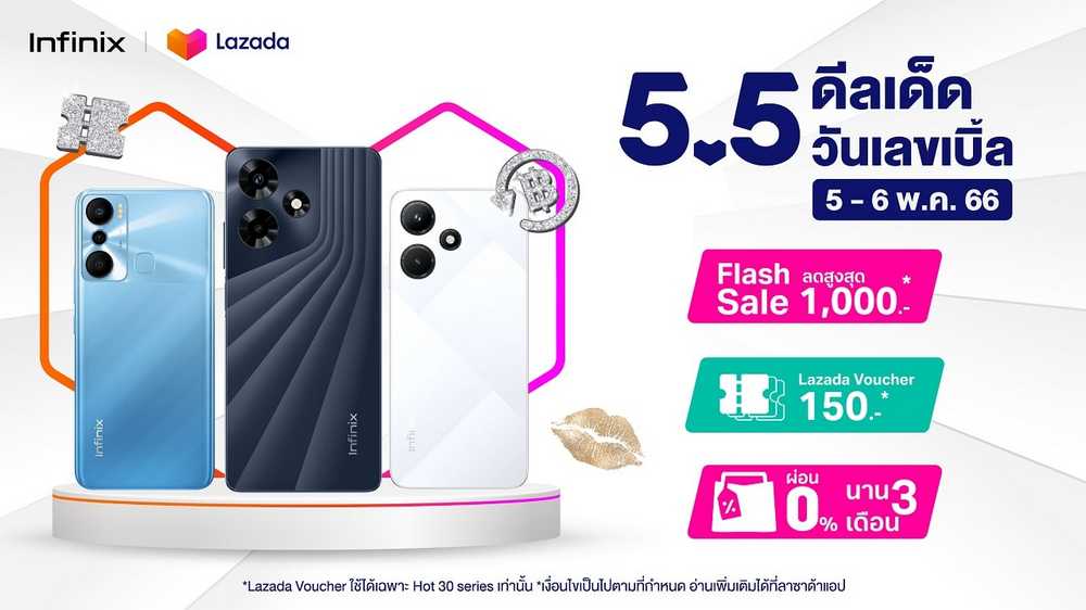 2. เมื่อซื้อสินค้าบน LAZADA ระหว่างวันที่ 5 – 6 พฤษภาคม 2566 รับสิทธิ์ซื้อมือถือราคาพิเศษ ในช่วงเวลา Flash sale ลดสูงสุด 1,000 บาท* พร้อม Voucher ส่วนลดอีก 150 บาท และรับข้อเสนอสุดพิเศษ ผ่อน 0% นาน 3 เดือน โดยมีสินค้าที่ร่วมรายการ อาทิ