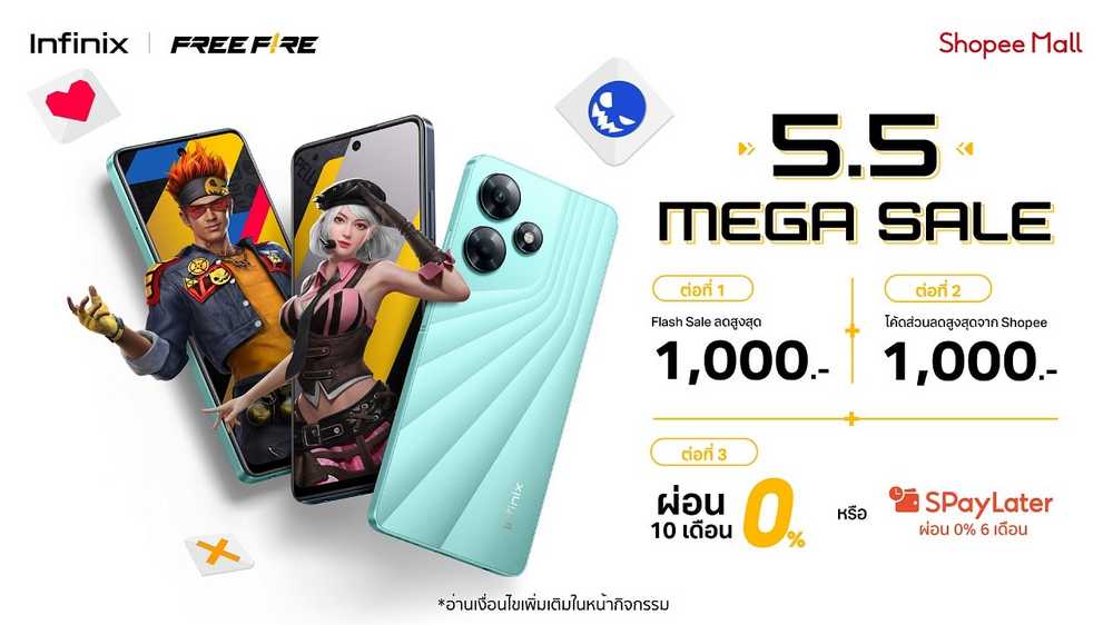 ด้วยส่วนลดสูงสุด 1,000* บาท พร้อมรับข้อเสนอผ่อนสบาย 0% สูงสุดนาน 10 เดือน* เมื่อซื้อสินค้าที่ร่วมรายการ โดยสามารถซื้อสินค้าได้ที่ร้าน Infinix Official Store บน Shopee, Lazada และ TikTok