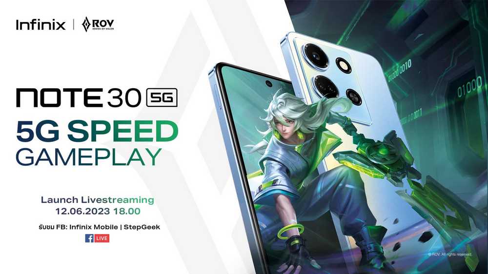 Infinix NOTE 30 Series ภายใต้สโลแกนคอนเซ็ปต์ “5G Speed Gameplay – 5G เกมมิ่งสมาร์ตโฟนหนึ่งเดียวที่มาพร้อม RoV Edition” โดยเป็นมือถือที่เน้นการใช้งานด้านการเล่นเกมและความบันเทิงเต็มรูปแบบที่ดีที่สุด ในเรทราคาที่คุ้มค่ามากที่สุด ชูจุดขายด้วยชิปเซ็ตทรงพลัง 5G MediaTek Dimensity 6080 6nm พร้อมยกระดับทุกการใช้งานอย่างเต็มประสิทธิภาพด้วยหน้าจอขนาดใหญ่เต็มตา 6.78 นิ้ว รีเฟรชเรทลื่นไหล 120Hz และให้เทคโนโลยีการชาร์จไว 45W เร็วที่สุดในเรทราคาเดียวกัน และพิเศษสุดกับการผนึกกำลังพันธมิตรชั้นนำอย่าง RoV ร่วมกันครีเอทแพ็กเกจด้วยลวดลายคาแรกเตอร์ และมอบฟีเจอร์ลิมิเต็ดอิดิชัน Infinix x RoV ตลอดจนเตรียมจัดเซอร์ไพรส์ด้วยกิจกรรมสุดเอ็กซ์คลูซีฟมากมายเพื่อเอาใจเหล่าสาวกคอเกมตัวจริง