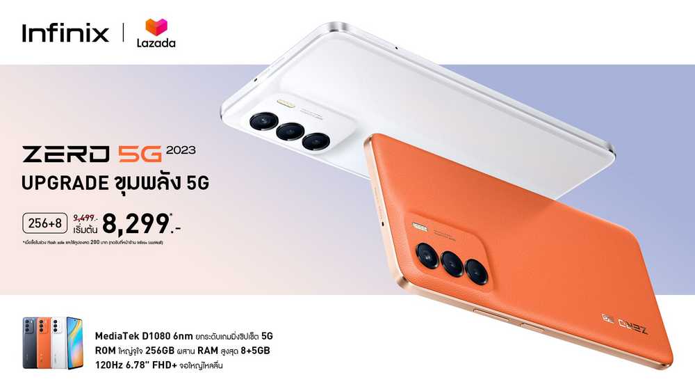 อินฟินิกซ์ (Infinix) แบรนด์สมาร์ตโฟนระดับโลกที่ได้รับความนิยมเป็นอย่างมากทั้งในต่างประเทศและประเทศไทย ล่าสุดเปิดตัวสมาร์ตโฟนระดับพรีเมียม Infinix ZERO 5G 2023 มาพร้อมกับสโลแกน “Power Upgrade – Upgrade ขุมพลัง 5G” เหนือระดับด้วยชิปเซ็ตเกมมิ่ง 5G จัดเต็มครอบคลุมทุกการใช้งาน พร้อมยกระดับประสิทธิภาพการใช้งานด้วยชิปเซ็ตทรงพลังจาก MediaTek Dimensity 1080 ขนาด 6 นาโนเมตร ผสานกับการใช้งานที่ไร้ขีดจำกัดด้วยหน่วยพื้นที่ความจำตัวเครื่อง 256GB และ Ram 8+5GB รวมถึงดีไซน์ที่โดดเด่นเป็นเอกลักษณ์ เน้นความเรียบหรู ทันสมัย เหมาะกับทุกไลฟ์สไตล์ เปิดตัวในราคา 9,499 บาท กำหนดวางจำหน่ายแบบ Online Exclusive ที่ร้าน Infinix Official Store บน Lazada ราคาพิเศษ 8,299* บาท ระหว่างวันที่ 7 – 15 ธันวาคม 2565