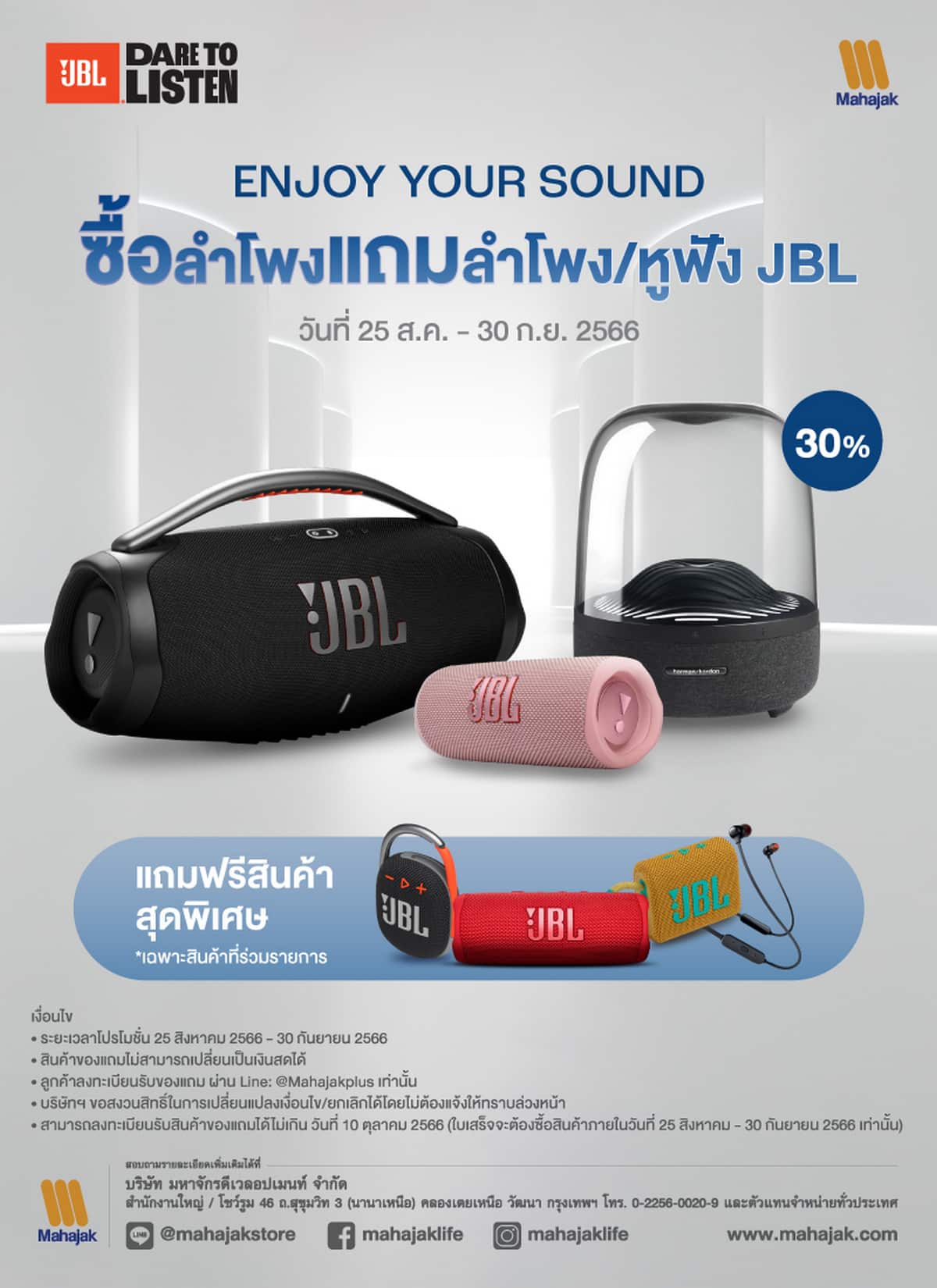 บริษัท มหาจักรดีเวลอปเมนท์ จำกัด จัดโปรโมชั่น Enjoy Your Sound เอาใจสาย Speaker Lover กับสินค้าลำโพง JBL และ Harman Kardon ทั้งลดทั้งแถม ลดสูงสุดถึง 30% (เฉพาะสินค้าที่ร่วมรายการ) สินค้ามีจำนวนจำกัด โปรโมชั่นตั้งแต่วันที่ 25 สิงหาคม 2566 – 30 กันยายน 2566 นี้เท่านั้น