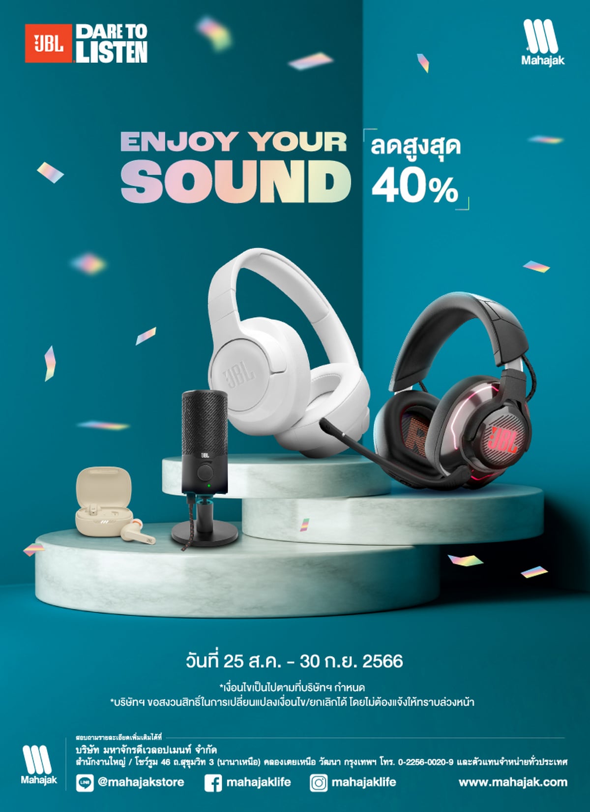บริษัท มหาจักรดีเวลอปเมนท์ จำกัด จัดโปรโมชั่น Enjoy Your Sound เอาใจสาย Headphone Lover กับสินค้าหูฟัง JBL ลดสูงสุดถึง 40% (เฉพาะสินค้าที่ร่วมรายการ) ตั้งแต่วันที่ 25 สิงหาคม 2566 – 30 กันยายน 2566 นี้เท่านั้น
