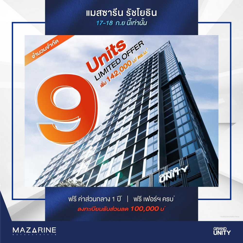 แกรนด์ ยูนิตี้ จัดโปรโมชั่นพิเศษต้อนรับเดือน 9 กับ 9 ยูนิตพิเศษ จากโครงการ “แมสซารีน รัชโยธิน” เริ่มเพียง 142,000 บาท / ตร.ม.* ดีเดย์ 17 – 18 กันยายนนี้15/09/2022PR News