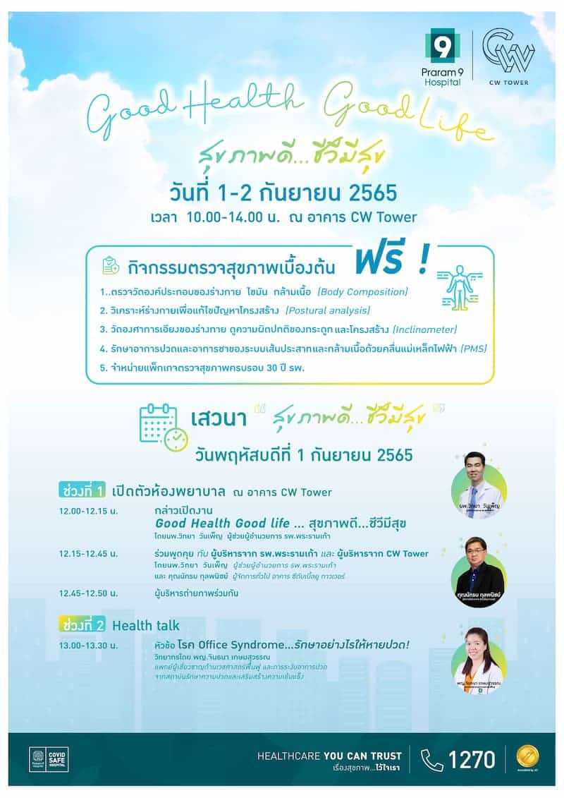 รพ.พระรามเก้า จูงมือ CW Tower ชวนตรวจสุขภาพเบื้องต้น ฟรี! ในกิจกรรม “Good Health Good Life สุขภาพดี…ชีวีมีสุข”31/08/2022PR News