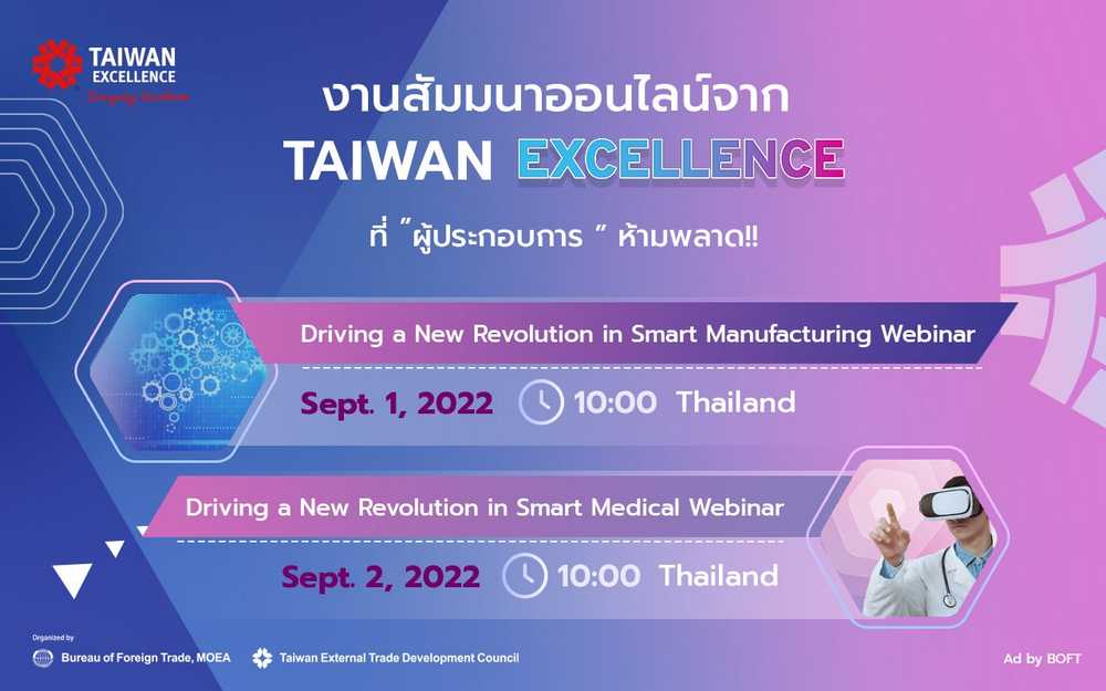 Taiwan Excellence โชว์เทคโนโลยีเครื่องจักรอัจฉริยะ และนวัตกรรมทางการแพทย์ ในงานสัมมนาออนไลน์ 1-2 กันยายน นี้ พร้อมขนทัพสินค้านวัตกรรมกว่า 60 รายการ เตรียมโชว์ในงาน Taiwan Expo in Thailand 31 ส.ค.- 4 ก.ย. นี้22/08/2022PR News