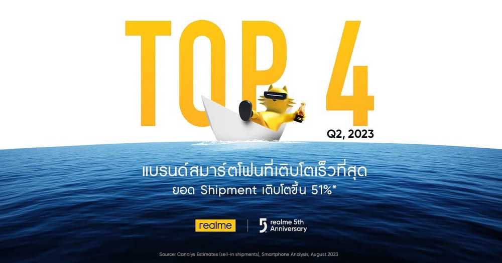 กรุงเทพฯ 10 สิงหาคม 2566 – realme (เรียลมี) แบรนด์สมาร์ตโฟนเพื่อคนรุ่นใหม่ที่เติบโตเร็วที่สุดในโลก ล่าสุดขึ้นแท่นแบรนด์มือถืออันดับ Top 4 ของประเทศไทย ที่มีอัตราการเติบโตของยอดการจัดส่งสินค้า (Shipment Units) สูงเป็นอันดับ 1 ในไตรมาส 2 ของปี 2566 อยู่ที่ 51% จากรายงานฉบับล่าสุดของ Canalys บริษัทวิเคราะห์ตลาดอุตสาหกรรมและเทคโนโลยี แซงหน้าแบรนด์เจ้าตลาดอื่น ๆ อย่างขาดลอย โดยทางแบรนด์ตั้งเป้าไต่ขึ้นสู่ Top 3 ในประเทศไทยในเร็วๆ นี้ นอกจากความสำเร็จในไทยแล้ว realme ยังครองอันดับ 5 ในตลาดเอเชียตะวันออกเฉียงใต้ ทั้งนี้ พร้อมประกาศความสำเร็จของแบรนด์ในฐานะผู้ส่งมอบนวัตกรรมทันสมัยในระดับราคาที่ผู้บริโภคจับต้องได้ สมดังวิสัยทัศน์ของแบรนด์ “Dare to Leap” อย่างแท้จริง นอกจากนี้ realme เตรียมจัดงานเฉลิมฉลองความสำเร็จครบรอบ 5 ปี เพื่อขอบคุณแฟนๆ ตลอดเดือนสิงหาคม