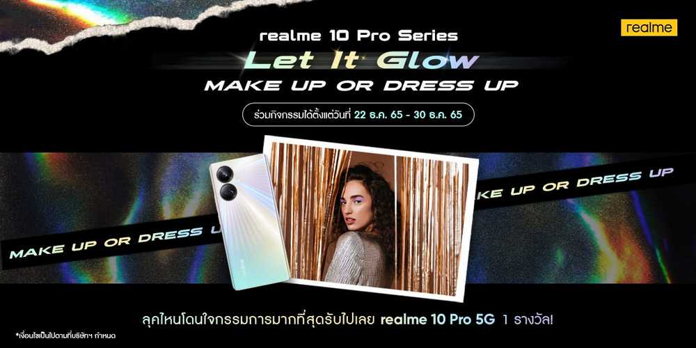 วันนี้ realme ขอส่งต่อความสุขสู่ผู้บริโภคอย่างต่อเนื่องกับแคมเปญ Let It Glow ชวนแฟน ๆ มาร่วมสร้างสรรค์เครื่องแต่งกายหรือสไตล์การแต่งหน้าสุดล้ำ (MAKE OR DRESS UP) ให้ตรงตามคอนเซ็ปต์ของ realme 10 Pro Series แล้วโพสต์รูปผลงานใต้โพสกิจกรรมบนเฟซบุ๊ก realme Official Fan Page พร้อมใส่แฮชแทก #InspiredByrealme #LetItglow #realmegoldenxmas โดยร่วมสนุกได้ตั้งแต่วันที่ 22-30 ธันวาคม 2565 ผู้ที่ถูกใจกรรมการ รับไปเลย realme 10 Pro 5G 1 เครื่อง โดยจะประกาศผลผ่านทางเฟซบุ๊กในวันที่ 4 มกราคม 2566