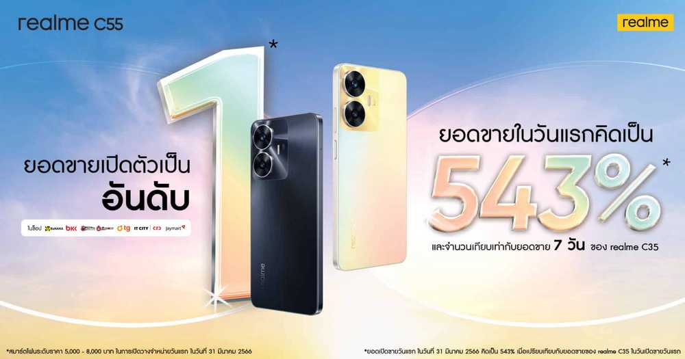 กรุงเทพฯ 3 เมษายน 2566 – หลังวางจำหน่ายใน Brand shop และตัวแทนจำหน่ายทั่วประเทศอย่างเป็นทางการเมื่อวันที่ 31 มีนาคมที่ผ่านมา realme C55 เจ้าของฉายา “A Champion of The Segment” สร้างปรากฏการณ์ถล่มทลายทุบสถิติยอดขายของ realme C-series ทุกรุ่น โดยในวันเริ่มวางจำหน่ายเพียงวันเดียว realme C55 สามารถทำยอดขายได้มากกว่า realme C35 รุ่นก่อนถึง 543% หรือมากกว่า 5 เท่า โดยยอดขายของ realme C55 ในวันแรกเพียงวันเดียว มีมูลค่าเท่ากับยอดขายรวมของ C35 ตลอด 1 สัปดาห์เลยทีเดียว!
