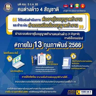 กรมการจัดหางาน ให้รีบเร่งดำเนินการต่ออายุใบอนุญาตทำงาน ตามมติ ครม.5 กรกฎาคม 2565 ภายในวันที่ 13 กุมภาพันธ์ 256610/02/2023PR News