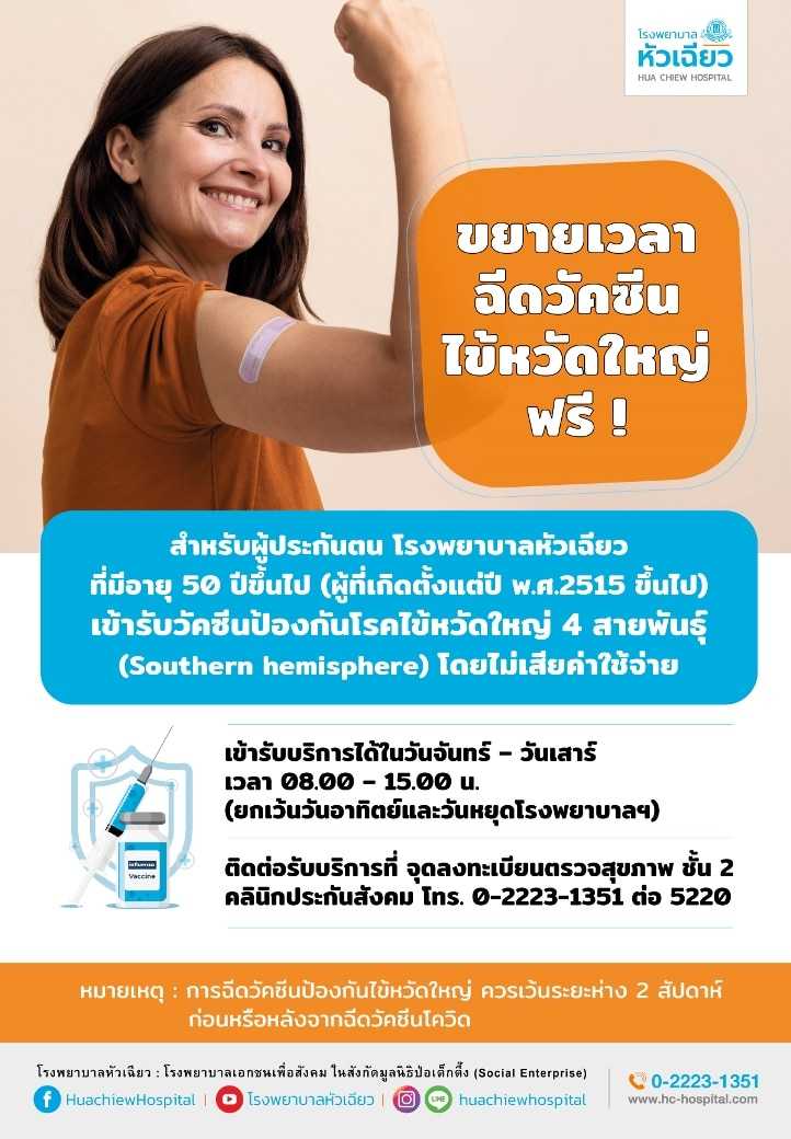 สำหรับผู้ประกันตนโรงพยาบาลหัวเฉียว อายุ 50 ปีขึ้นไป เข้ารับวัคซีนไข้หวัดใหญ่ โดยไม่เสียค่าใช้จ่าย17/11/2022PR News